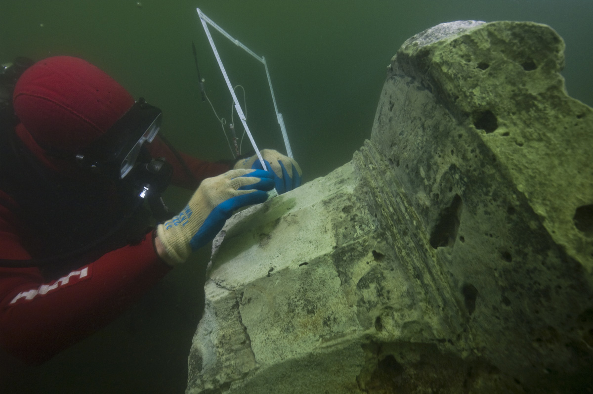 An archaeologist measures the base of a column discovered on the site of the temple of Amon Gereb at Thonis-Heracleion, Bay of Abukir.